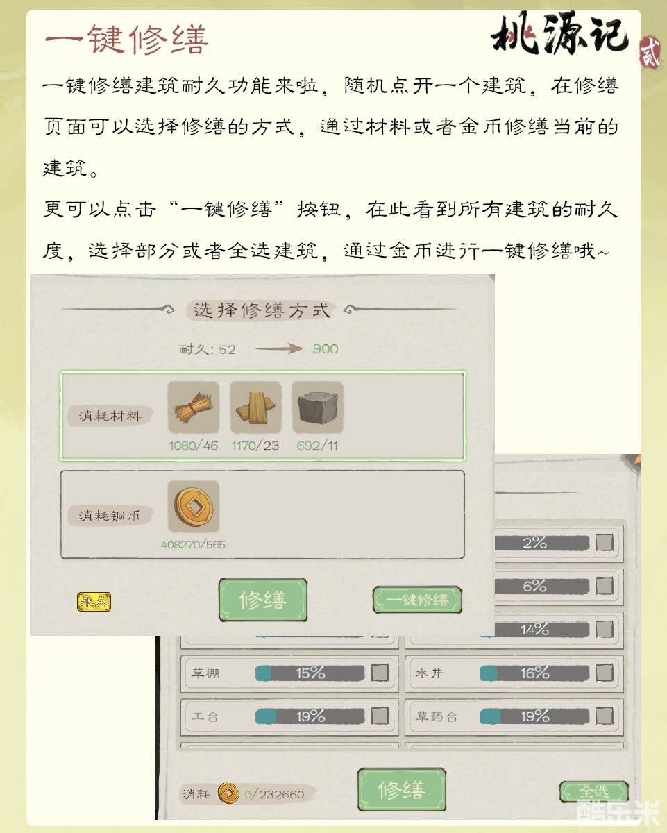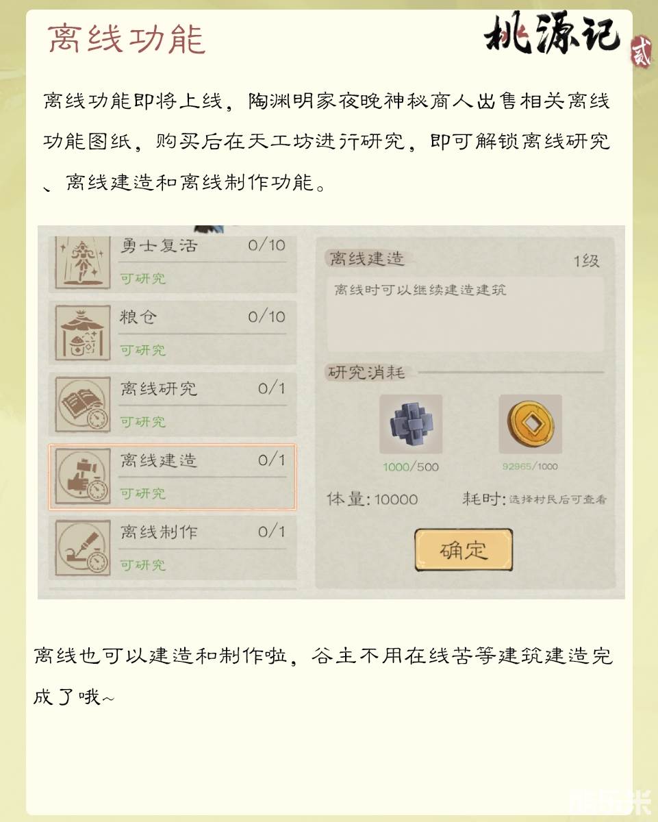 桃源记2离线功能什么时候上线,游戏以陶渊明《桃花源记》为灵感,打造沉浸式古风生存建造手游。玩家将带领村民遁入山谷,从零开始拓荒求生,为了提升玩家们的游戏体验,近期将上线一键修缮功能、离线功能以及村民居所分配和婚配功能,下面和酷乐米小编一起来看看吧