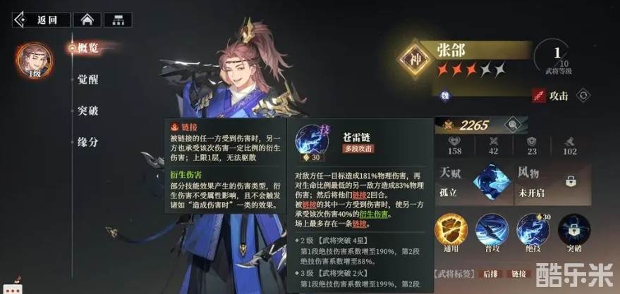 需要特别注意的是战场上的链接效果并非无限叠加,最多只能存在一条链接,且这条链接一旦形成,便无法被任何手段驱散,这种机制不仅增加了战斗的复杂性和策略性,也让张郃的每一次攻击都充满了变数与可能,而张郃这里大家就可以尝试用关羽来作为主要输出,然后加成赵云、刘备、张飞及蹇硕的阵容。