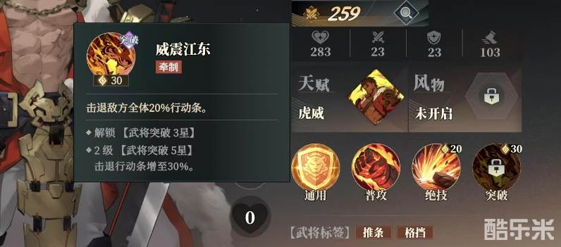 孙坚的技能效果使得对手在承受高达121%的物理伤害的同时,还要面临行动条被击退20%的困境,且孙坚的技能还能为目标附加一层独特的威慑状态,这一状态下的敌人,其伤害输出能力将直接降低15%,这样的技能组合可以说他是一个很好用的控场大师了,所以无论游戏处于哪个阶段,孙坚都是一位值得培养的武将,他的真正价值在于与对敌人行动的有效限制效果。