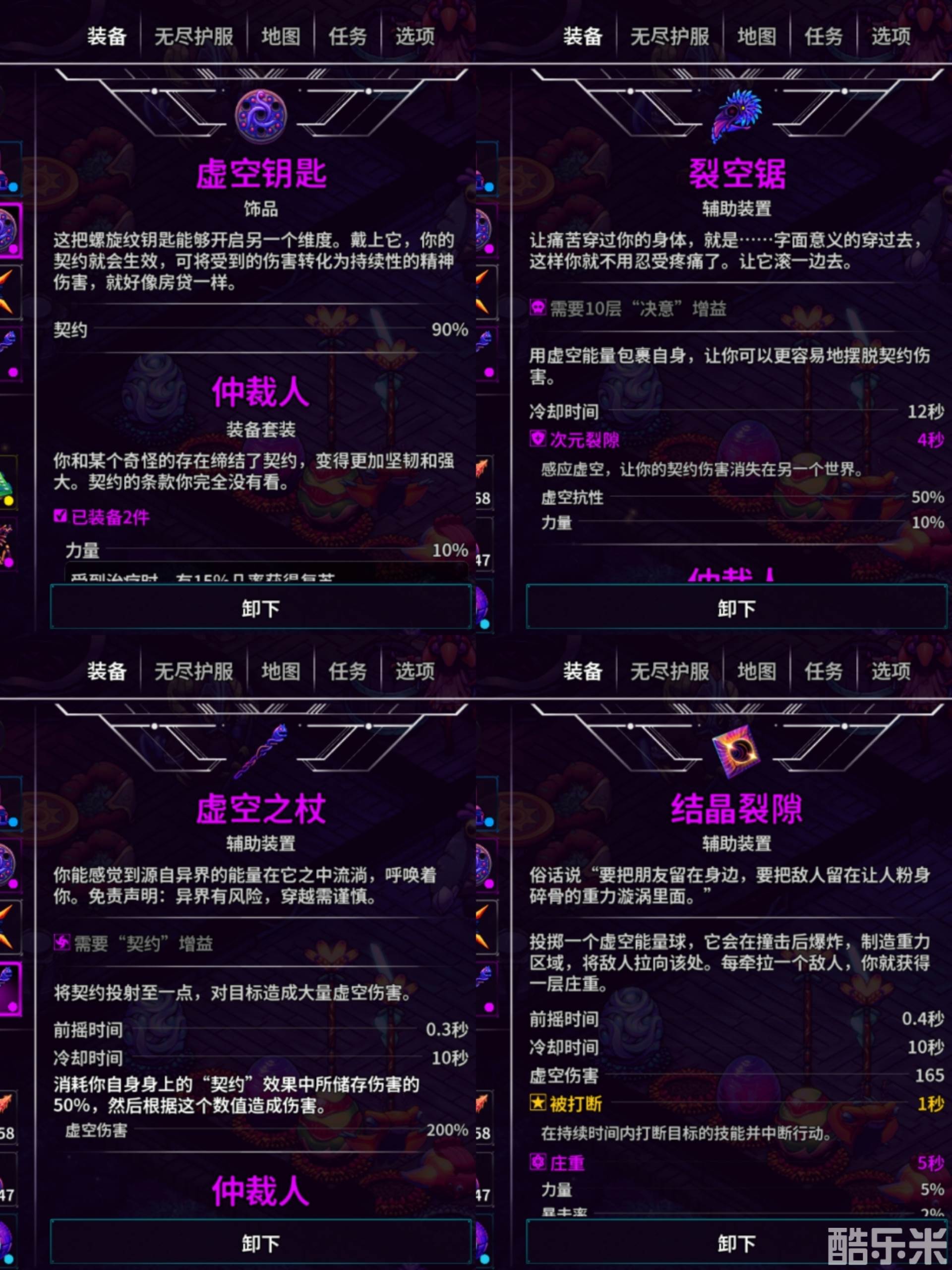 触发原理是:虚空锤站撸,增加契约伤害和叠加层数触发法杖和裂空,钥匙将受到的伤害缓存,裂空延迟伤害生效的时间,最后使用法杖将累积的伤害打出,产生远程单体的高额伤害。