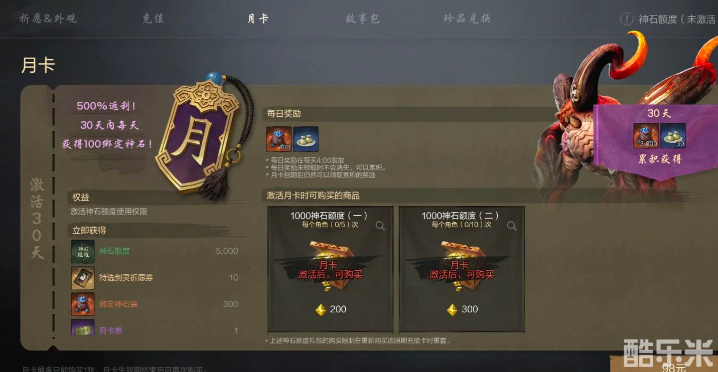 月卡可以在首次充值期间,直接为玩家提供五千点的神石额度,并且在后续的每天内,为玩家提供一千颗神石的奖励,在激活之后,玩家还可以获取绑定的神石券,神石券还能够进一步,为玩家提供三百点的神石。
