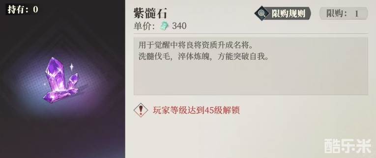 对于追求更高战力的玩家而言,紫髓石的作用可太大了,它能够将蓝色武将卡牌升级为紫色品质,不过要想解锁使用紫髓石的话,其实在游戏中也是有使用门槛的,大家需要等到自己的等级已经达到45级之后,才能够解锁使用,而且目前在游戏中,获取紫髓石的途径相对有限,所以从前期开始囤才是最好的。