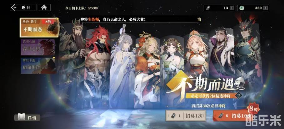 三国志幻想大陆2枭之歌新手池怎么样?其实大家都应该了解一下,这是新手玩家们开启游戏征程时首推的选择,就目前的游戏设定而言,这是一个专门为新手量身打造的打折卡池,其概率优势是很大的。下面和酷乐米小编一起来看看吧