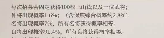 而且这个卡池还设有十分诱人的固定奖励机制,无论玩家每次抽取的结果如何,都能在每一次抽取中,获得100枚珍贵的三山钱,同时每次抽取还会必定获得一位武将,即使没有抽到高品质的神将或名将,也能积累不少可用的武将资源。