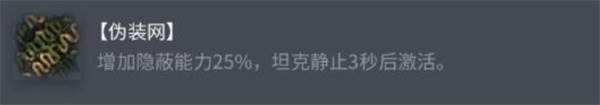 效果:增加隐蔽能力25%,坦克静止3秒后激活。