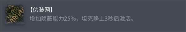 效果:在坦克静止3秒后激活,提供 +25% 的隐蔽加成