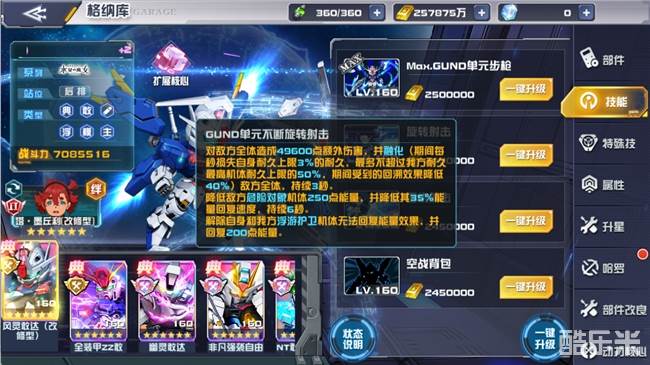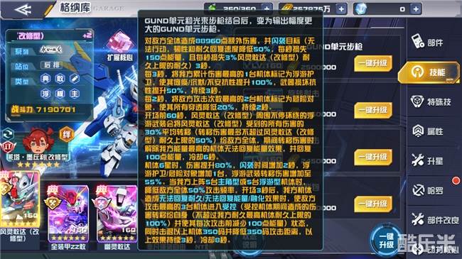队长技【GUND浮游武装】同样不容小觑,除了每4秒为我方全体机体回复能量,还能增加特定类型机体的攻击频率。除此之外,3技能【围绕射击】可造成伤害、限制敌方回复耐久等;缘分技能【帕梅特刻痕】和机师技能分别可提升自身全属性搭乘机体属性。这些技能让风灵敢达(改修型)在战场上的表现极具统治力,使用得当或许能轻松改变战局!
