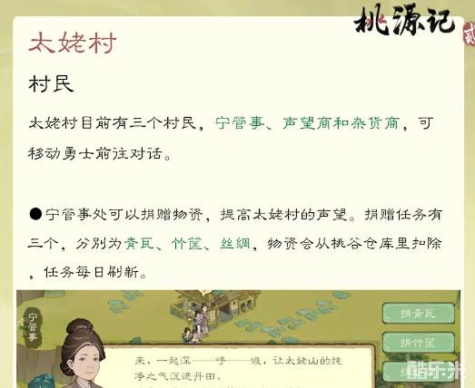 在这一个地方有三个村民,分别就是宁管事、声望商和杂货商,每个人负责的事情都会有所不同,另外这里还会有一个捐赠任务。主要的捐赠物资包括青瓦、竹筐、丝绸,玩家想要体验的话就可以来操作一下,这些物资就会从仓库里面直接扣除。