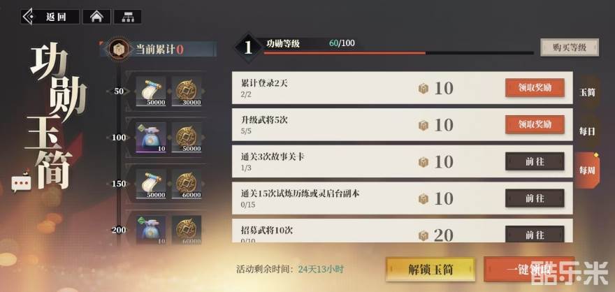 这里的玉简系统和其他游戏中常见的战令系统有着一定的相似之处,玩家可以在游戏主界面左下角的目录当中,进而进入这个系统,进入玉简系统后,首先映入眼帘的便是功勋值的获取方式,玩家通过完成每日任务以及每周任务,都能够获得相应的功勋值,每日任务的内容可谓是丰富多样,几乎涵盖了游戏里各种各样的玩法和活动。