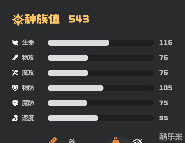 巨灵石作为地系精灵的一种,它的防御能力和生命力是十分出色的,生命力116、物攻和魔攻均为75、物防105、魔防75、速度95,从各个属性值不难发现它的速度比较慢,而物攻和魔攻非常的均衡,为此我们在选择技能时就需要考虑是走魔法攻击的路线,还是走物理攻击的路线。