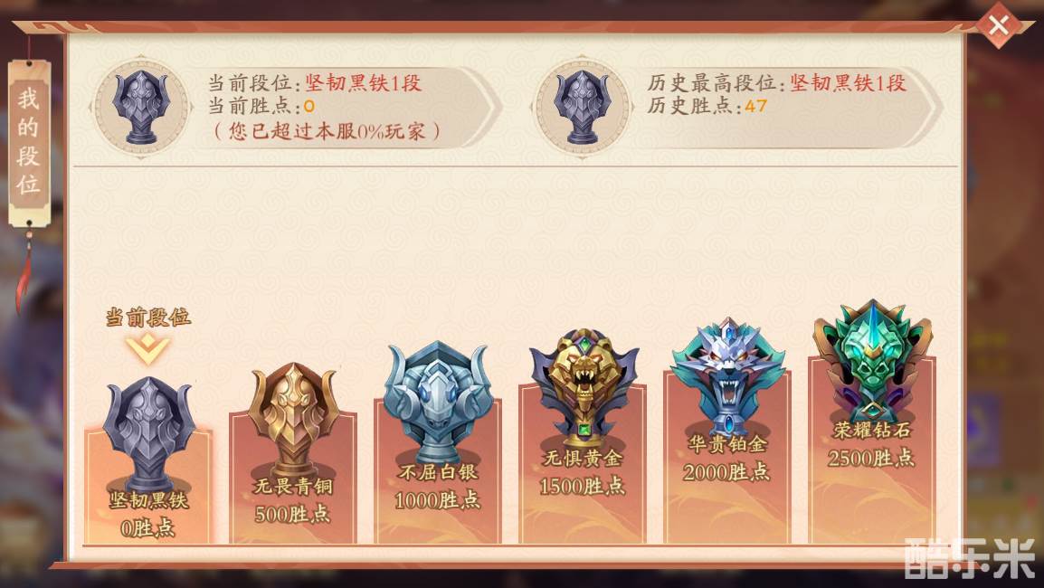 ✦初始都为最低段0分,每周段位的刷新会根据上个赛季进度回退5个小段位,无双王者及以上段位则回退至无双王者0胜点