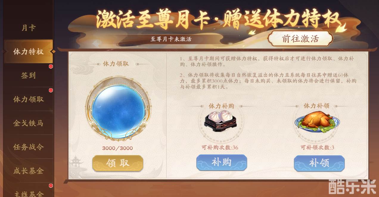 1、体力会随时间自动恢复,达上限溢出的体力将会存到体力特权中,开通至尊月卡可领回溢出的体力,并可补购昨日未购买得体力,以及补领未领取得体力。