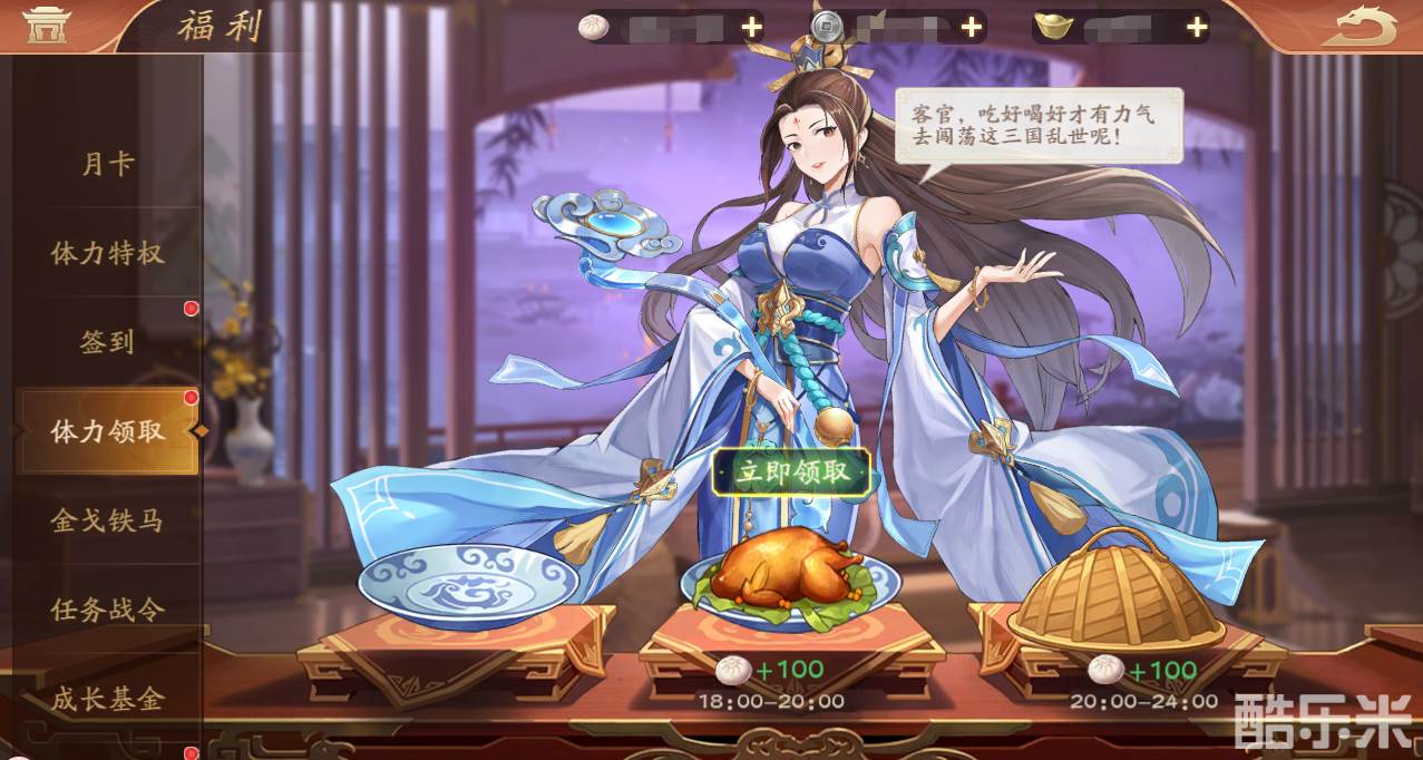 3、福利-体力领取,每日12:00、18:00、20:00可以领取体力,错过可用元宝补领。