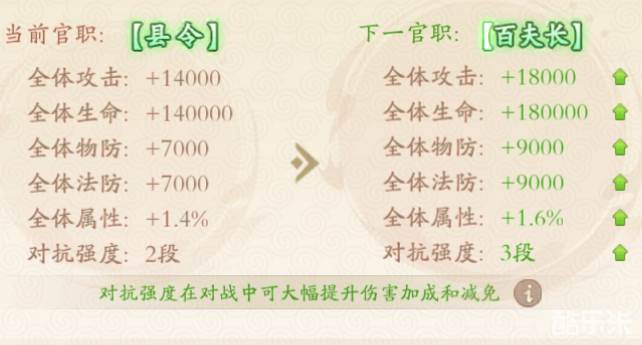 ✦官职可提升全体上阵武将的全体属性、全属性百分比及对抗强度段位。