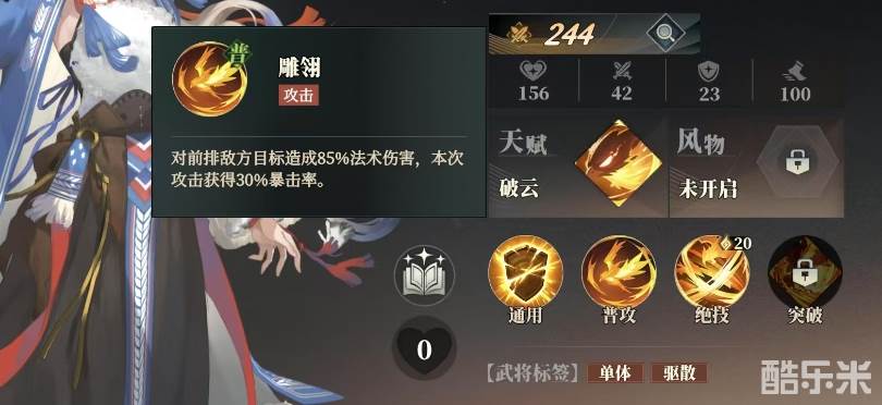 大家手中的资源往往都比较有限,这时候要是获得了邹翊,直接上场让她参与战斗也未尝不可,凭借她独特的技能机制,还能在前期的战斗中打出亮眼的表现,邹翊的普攻名为雕翎,当她发起攻击时,便会直指前排的敌方目标,携带着85%的法术伤害,而且此次攻击还附带了30%的暴击率,也就是说,每一次普攻都有机会打出高额的伤害。