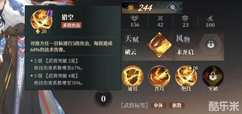 绝技猎空,这一技能一旦释放,便能让她对敌方任一目标展开连续3段的猛烈攻击,每一段攻击都能造成64%的法术伤害,那伤害量叠加起来,可是相当可观的,并且随着武将突破的不断深入,她这绝技的伤害系数还会进一步提升,当达到2星突破时,绝技的伤害系数就能提升至67%,而到了4星突破的时候,更是能达到惊人的70%,所以在面对敌人时,能够打出更高的爆发伤害。