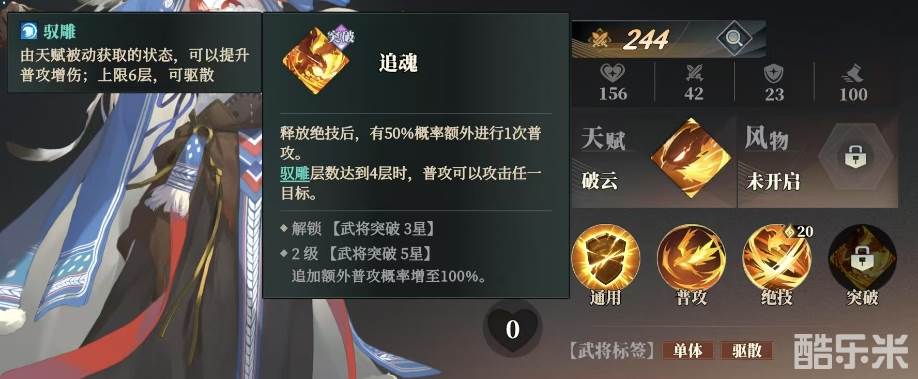 除了这些强大的主动技能之外,邹翊还拥有一项别具一格的突破技能,叫做追魂,每当她释放绝技之后,便有50%的概率能够额外进行一次普攻,大家可以把这一效果看成是一次追击技能,而当她的驭雕层数累积到4层的时候,普攻更是可以直接无视敌方阵型,随心所欲地攻击任一目标,这种灵活性使得她在战场上拥有了多种多样的用法。