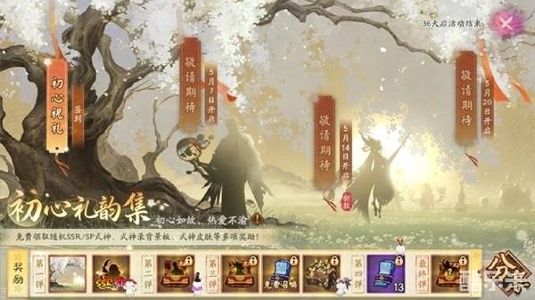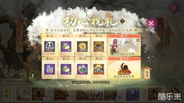 2、累计签到第5天、第10天可分别获得限定纪念背景板「曦樱故约」、随机SSR/SP式神。