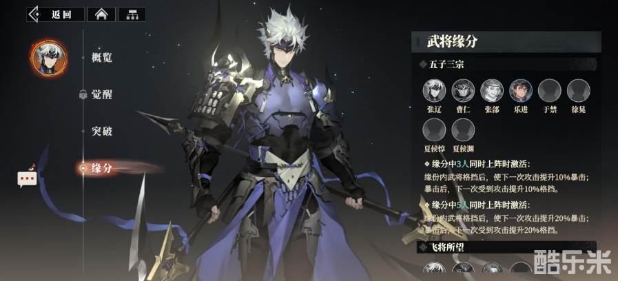 游戏中还存在着需要5名武将同时上阵才能激活的大型阵法缘分,以经典的五子三宗缘分为例,其中涉及到张辽、曹仁、张郃、乐进、于禁、徐晃、夏侯惇、夏侯渊等一众名将,在这个缘分组合中部分武将头像呈现灰暗状态且仅有名字显示,这意味着该武将尚未在游戏中实装,当满足这一缘分条件时,便能够激活独特的效果,比如在该缘分体系下,武将格挡后下次攻击将提升暴击几率,而暴击后下次受击则会增加格挡概率,这种连锁反应式的增益效果。