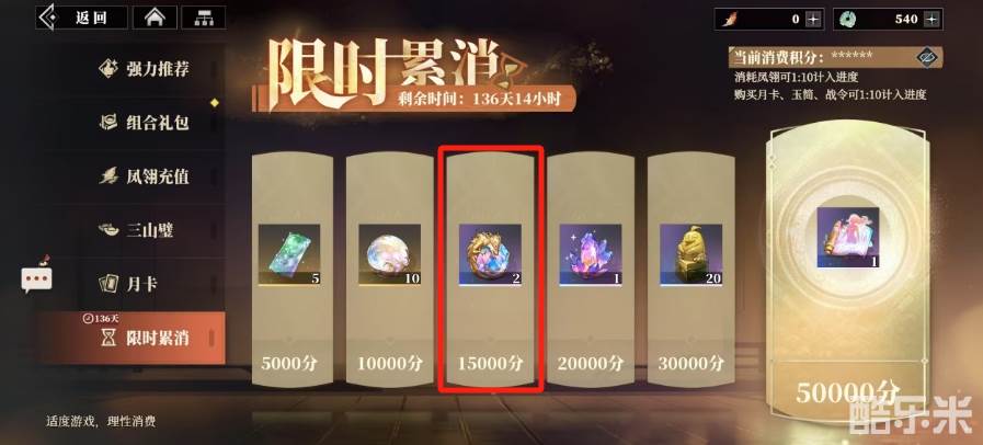 除了常规的商店购买之外,限时累消活动也为玩家开启了一扇获取枭山魂珠的新大门,在这个特定的活动期间,玩家通过在游戏中的各种消费行为积累积分,当前的消费积分达到15000分时,便可以收获两个枭山魂珠作为奖励,按照当前的氪金比例仔细换算下来,玩家大约需要投入1500元才能获得这样的奖励,相较于商店限购所带来的固定成本来说还是比较贵的。