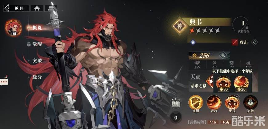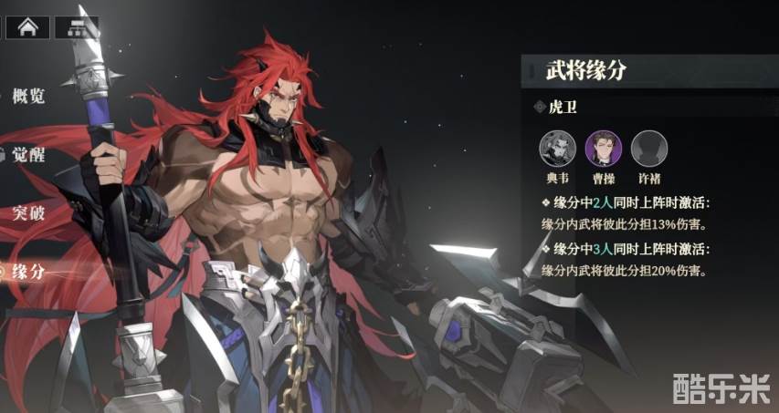 与此同时典韦进入了暴起状态,在这个状态下典韦的各项战斗属性都得到了全面的提升,而在武将缘分方面,典韦与典书、曹操、许褚是有羁绊效果的,两个人可以激活,此时缘分内的武将彼此之间能够默契地分担13%的伤害,而当这三人同时上阵时,缘分内武将彼此分担的伤害大幅提高到20%。