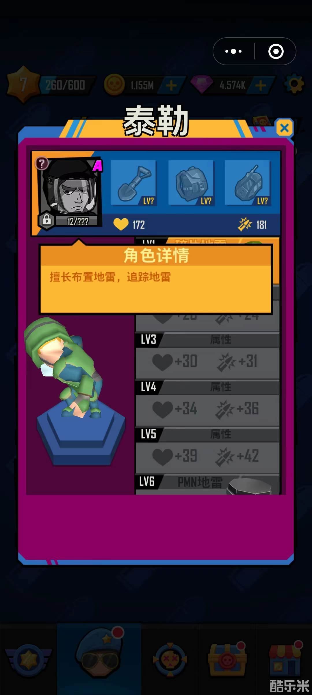 5号:戴尔,游戏里唯二输出担当的另一个,攻击方式为指挥无人机对僵尸造成群体伤害(此为9个常规士兵中最远的攻击距离),提升第三个装备可以提升伤害和无人机的数量,满级可拥有5架无人机,从装备方面来说,满装备的情况下有比1号杰瑞更高的攻击。额外说一句,他的无人机能捡金币、钻石、锄头和史诗挑战里的代币,懒人挂机时的福音。