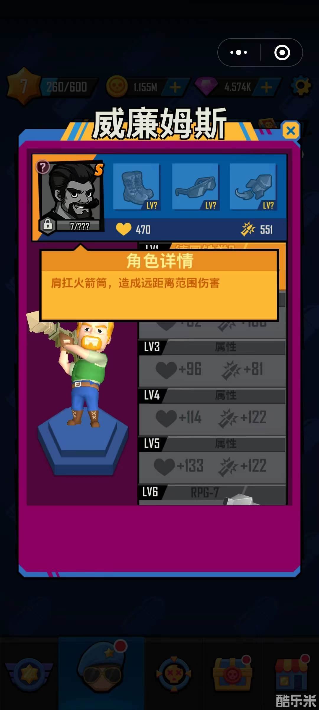 6号:威廉姆斯,游戏里必须培养的另一个,攻击距离远还是群体伤害,最重要的一点是,他的攻击能破盾。技能是同时发射多枚火箭弹攻击敌人,他的特点是技能并非像其他人那样靠时间恢复,而是通过攻击僵尸来满足技能的激活。