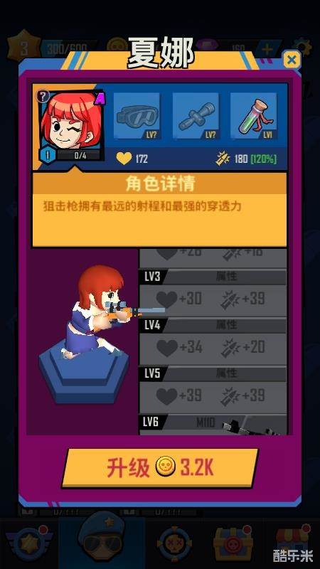 10号:夏娜 狙击手,通过第三关付费解锁,初始A级英雄,狙击枪拥有最远的射程和最强的穿透力,技能会心一击可以秒杀小怪,对强大的敌人造成巨大伤害,在有些比较难啃的关面前,不妨试试夏娜的狙击能力。