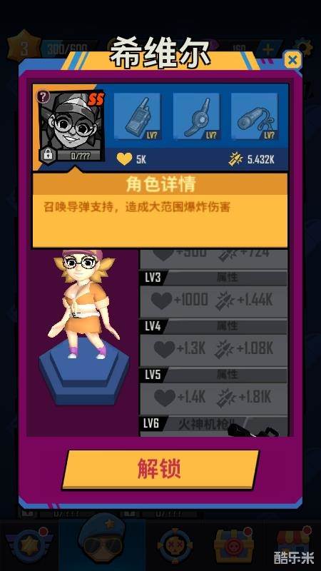 11号:希维尔 通讯兵,通过第三关付费解锁,一个喜欢扭屁股的女人,游戏初始唯一一个SS级英雄,召唤导弹支持,造成大范围爆炸伤害,第三件装备满级,可以将导弹数从5提升到11,攻击范围远,伤害也很炸,是挂机选择之一。
