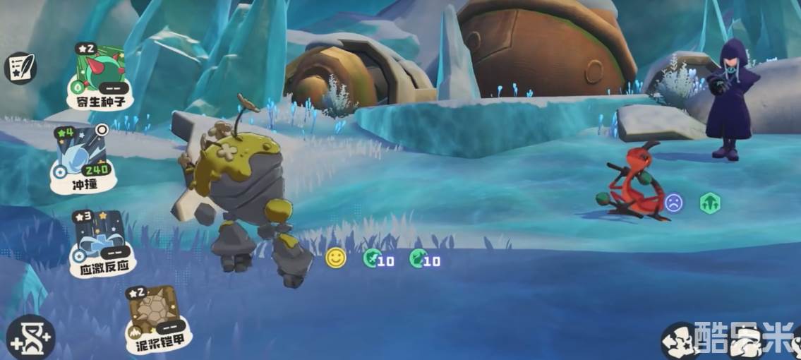 冲撞是物伤直击,并且这个技能每回合能耗-1点,本身记遗石的特性就能减能耗,这样可以获得进一步的提升。应激反应则是回血25%,如果成功应对防御则能回血80%。泥浆铠甲则可以提升50%的双防,应对防御则增益翻倍。