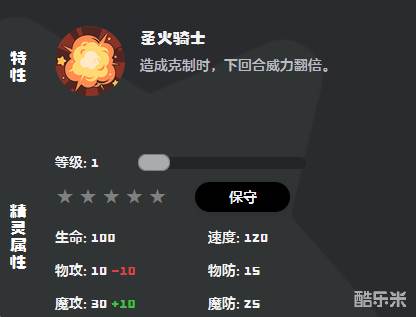 该精灵的特性是圣火骑士,造成克制时,下回合威力翻倍。他的资质560点,其中生命98,物攻60,魔攻124,物防86,魔防112,速度80。从属性上来看,在魔防和魔攻方面比较出色,物攻本来就已经很拉垮,所以在选择性格的时候,直接去加魔攻减少物攻。适合这样属性的性格,小编推荐选择保守,这样可以达到最佳的效果。