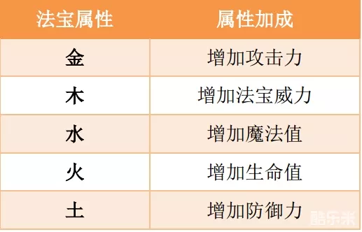 目前,法宝的属性分为5类:分别为金、木、水、火、土。