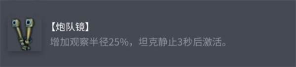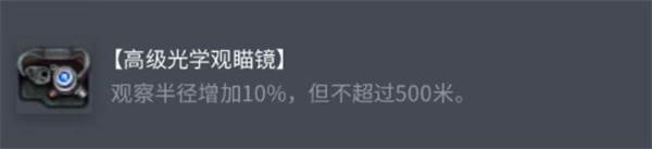 虽然提升幅度不如炮队镜(仅10%),但优势在于移动中也能生效,适合边侦察边走位的打法,观察半径最多可提升至500米。