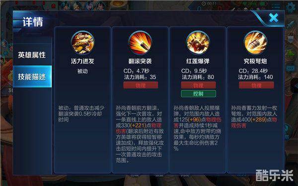 孙尚香朝前方翻滚,强化下一次的普攻,对一条直线上的敌人造成高额物理伤害,如果附近有敌人还将获得短暂的移速加成。该技能是孙尚香的主要输出技能,以及位移技能,能否打出优势就在于该技能的使用。