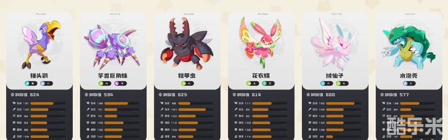 锤头鹳+芋香巨角蛛+铠甲虫+花衣蝶+绒仙子+水泡壳,整个队伍被称之为双核队伍,第一个核心是芋香巨角蛛,它的特性是毒腺,使用能耗小于2的技能时,会赋予敌方三层中毒,每层中毒则会造成3%最大生命值的伤害,换下场后则会清除,中毒效果是可以实现持续叠加的,不跟随精灵。配合湿润印记,每一层湿润印记都会给己方所有精灵的技能能耗-1。