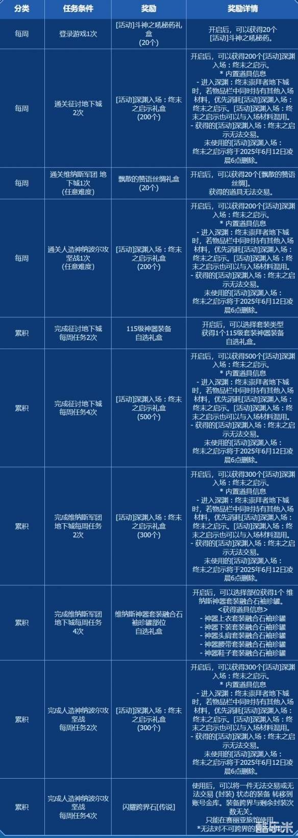 3、其中累积完成征讨地下城每周任务2次还能获得【115级神器装备自选礼盒】。