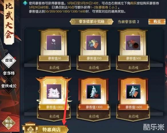 1、打开【比武大会-特惠商店】,找到【每周福利】点击领取;