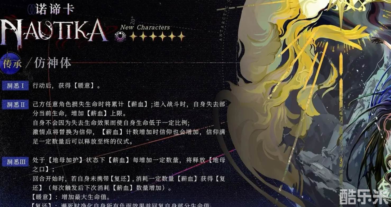 重返未来1999诺谛卡怎么样?作为游戏当中二周年庆典内的主要新角色,她的人物设定是挪威探险家罗尔德的后裔,虽然她原生是普通人类,但在后续,因为特殊原因,进化成为了半兽人,下面和酷乐米小编一起来看看吧