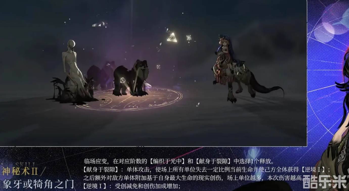 神秘术”象牙或犄角之门”,可以在不同的阶段当中,选择不同的释放效果,例如,当玩家使用分支技能“现身于缝隙”时,就可以使场上所有的己方单位,失去一定的生命数值,并且为己方增添一层逆境效果,逆境效果可以额外的对敌方,附加基于自身血量数值的现实伤害。