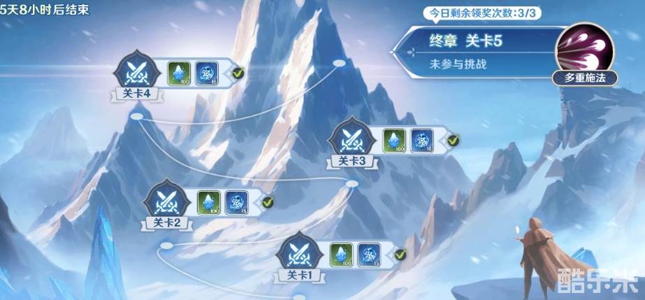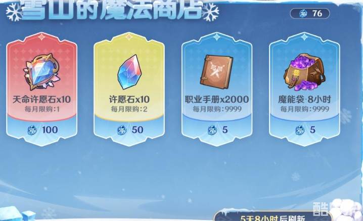 通关关卡可获得纯净冰晶和雪山圣物奖励,消耗雪山圣物可在【魔法商店】兑换天命许愿石、许愿石职业手册、魔能袋·8小时的奖励(每月限购)
