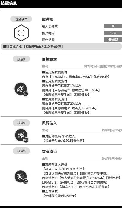 再来看她的技能体系,技能1目标锁定,当使用爆发技能时,自身会获得目标锁定1的效果,得到暴击率6.26%的数值,且这一状态能够持续45秒,在这时间内,她每一次攻击都更有可能触发暴击,而当使用爆裂技能时,若自身恰好处于目标锁定1的状态,那么便会激活目标锁定2的时候,暴击伤害就变成18.03%,同样持续45秒,此时她的暴击伤害会得到提升。