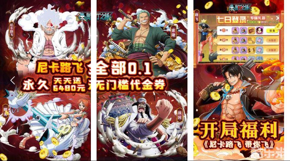 0.1折尼卡路飞免费带你飞! 每日免费送6480元无门槛代金券! 首续永久0.1折,首充0.06元!全新版本更多海贼角色为你保驾护航,点燃你的经典情怀,重启航海远征之旅!