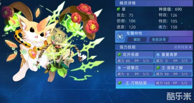 灯转福来是花灯仙子的先手神技,它可以吸取并反转对手能力提升状态,一旦成功便能打乱对手的强化节奏,若自身处于能力提升状态,每次攻击还能恢复自身体力的一部分,大大增强了自身的续航能力,若对手处于能力下降状态,则使对手随机技能的PP归零,有效干扰对手的技能释放,祥灯天意是一个必中技能,使用后4回合内免疫所有受到的异常状态,这在面对擅长施加异常干扰的精灵时,能够让花灯仙子从容应对,自身不会陷入异常,保证技能释放与战斗节奏。