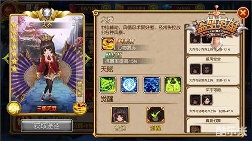 每当我们读到三国历史,大小乔这两位绝世美女便会伴随着脍炙人口的诸般事迹而为众多玩家魂牵梦绕。如今,大乔化身辅助型英雄率先登陆梦境大地,携手一同到来的丈夫孙策再度还原三国阵营战队的辉煌。大乔形象一如既往的娇弱,但小小的身躯在战场上爆发出惊人的能量,她可以为队友制造护盾,附加闪避光环,必杀技释放治愈风暴,持续击退范围内的敌人,帮助友方单位持续回血,为前排冲锋陷阵的队友提供无微不至的关怀。