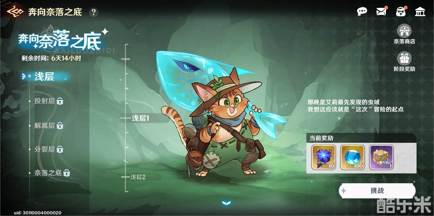活动开启后,副团长可挑战活动专属关卡,共分为浅层、投射层、解离层、分裂层、奈落之底5层,每天解锁一层,每层还有一定数量的小关卡,挑战完成所有小关卡之后级通关本层。