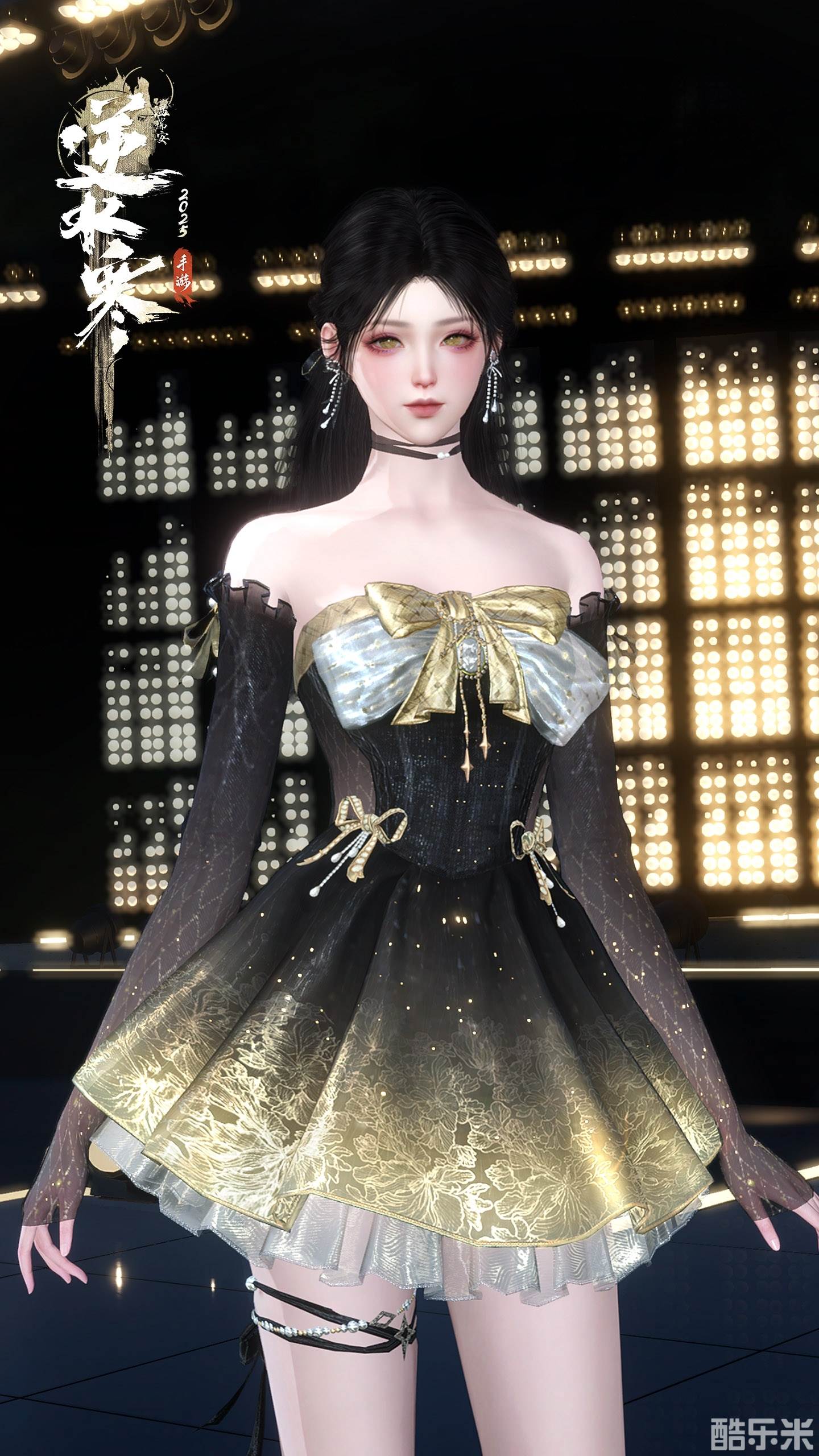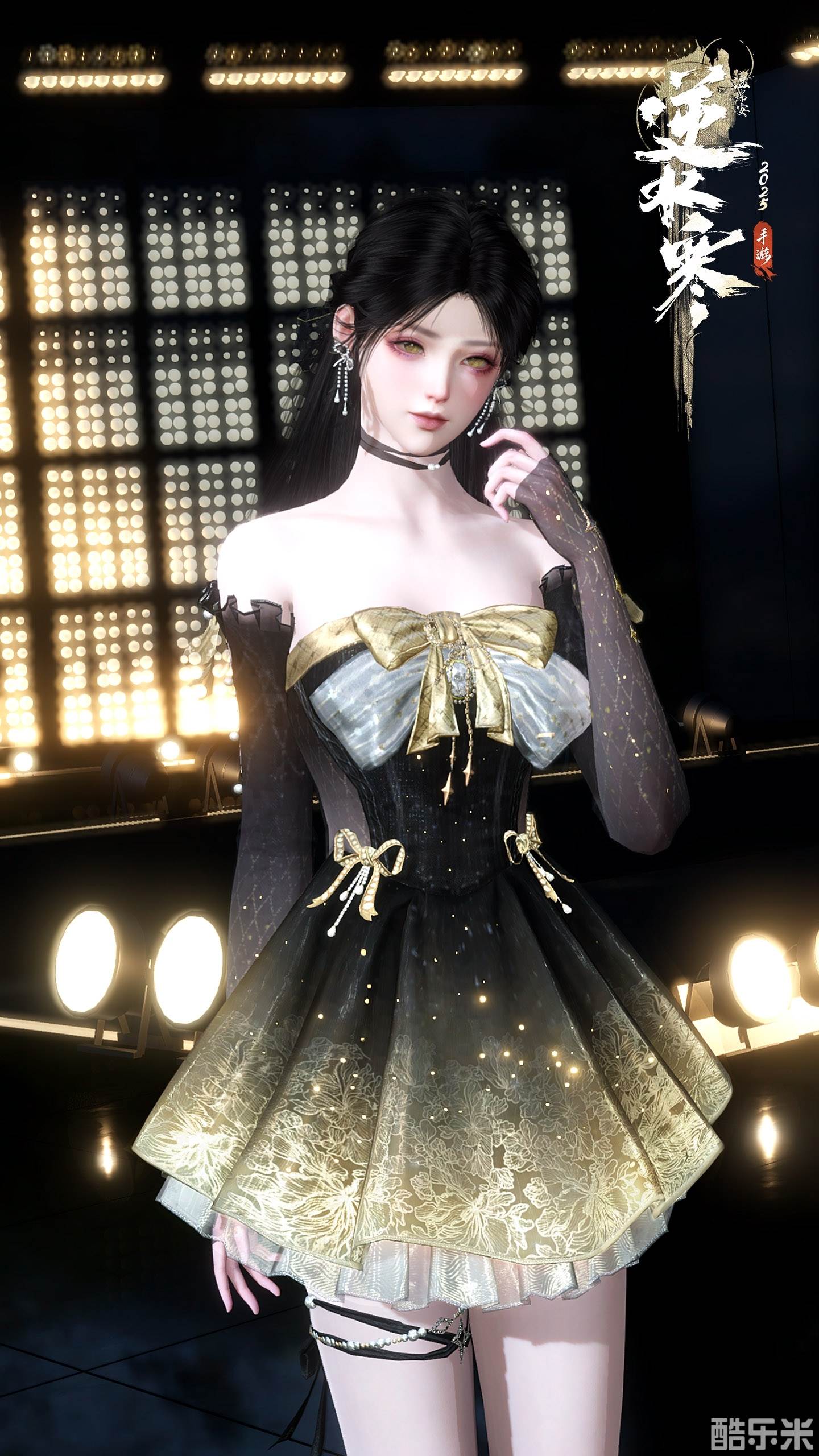 是在舞台上闪耀的乐队成员,也是永劫无间英雄季莹莹的同款女装。女款时装【音律织光】,巧妙的用金丝绣线模拟出洒满星辉的夜晚,黑色的夜空与闪耀的星辰一起,铭记下舞台上最美的一刻。