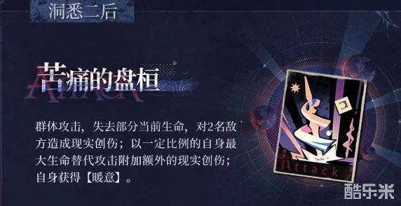 1、双自标攻击技能·苦痛的盘桓:首先失去部分生命造成伤害,其次以最大生命值为基础造成额外伤害最后获得一定层数的「暖意 ]。