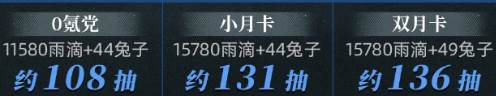 3、双月卡:15780雨滴+49兔子,约136抽。