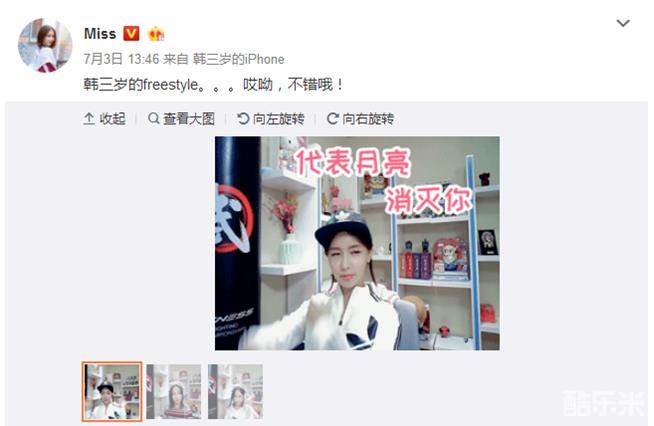 可以看到,微博中我们的大小姐自封艺名韩三岁,而下面三张GIF则是展现自己freestyle水平的直播截图。接下来让我们来鉴赏一下,我们电竞圈女神的即兴说唱能力究竟如何吧!