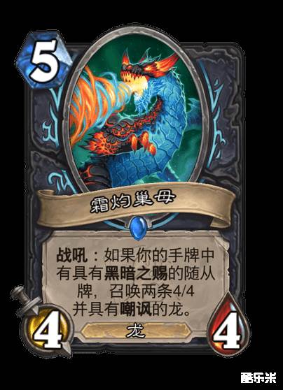 效果:战吼:如果你的手牌中有具有黑暗之赐的随从牌,召唤两条4/4并具有嘲讽的龙。